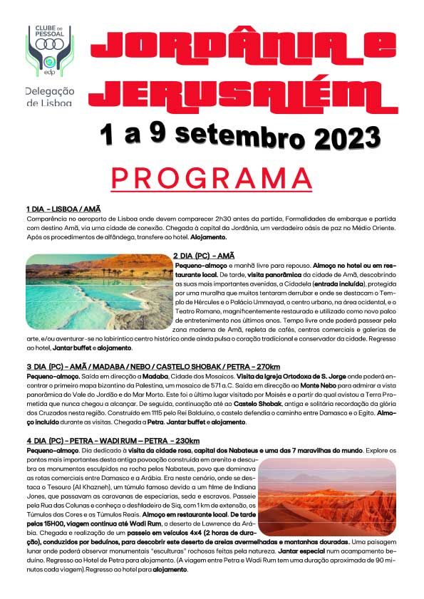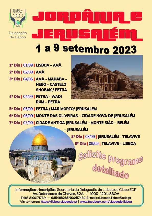 02JanFacebookTwitterGoogle+LinkedInPinterest Viagem à Jordânia e Jerusalém - 1 a 9 setembro 2023 Notícia atualizada em julho 2023 Viagem de 9 dias pelo Médio Oriente — Jordânia e Jerusálem. Inscrições esgotadas! Boletim de Inscrição Programa Cartaz Viagem à Jordânia e Jerusalém— 1 a 9 de setembro 2023Viagem de 9 dias pelo Médio Oriente — Jordânia e Jerusálem.Inscrições esgotadas!Sabe mais:Boletim de Inscrição (pdf)Programa (pdf)Página dos Passeios e Viagens