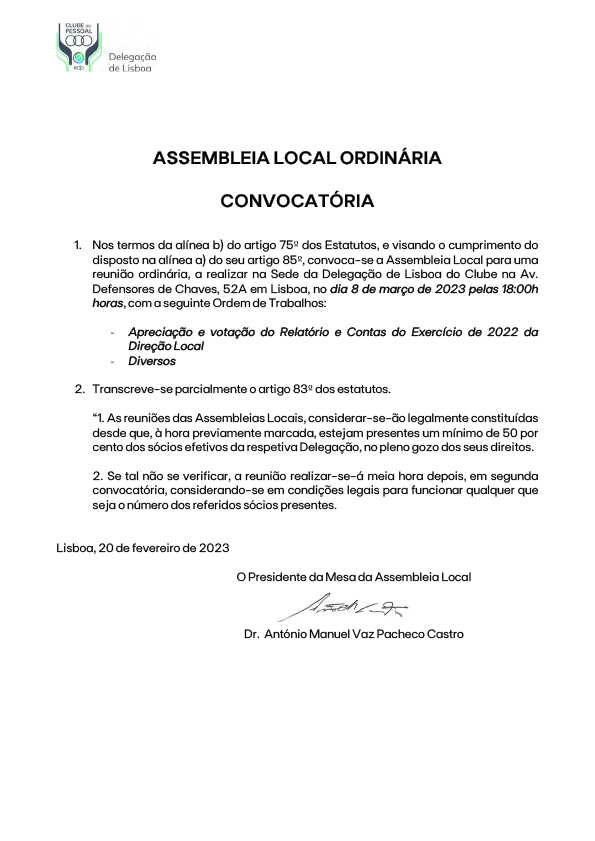disposto na alínea a) do seu artigo 85º, convoca-se a Assembleia Local para uma