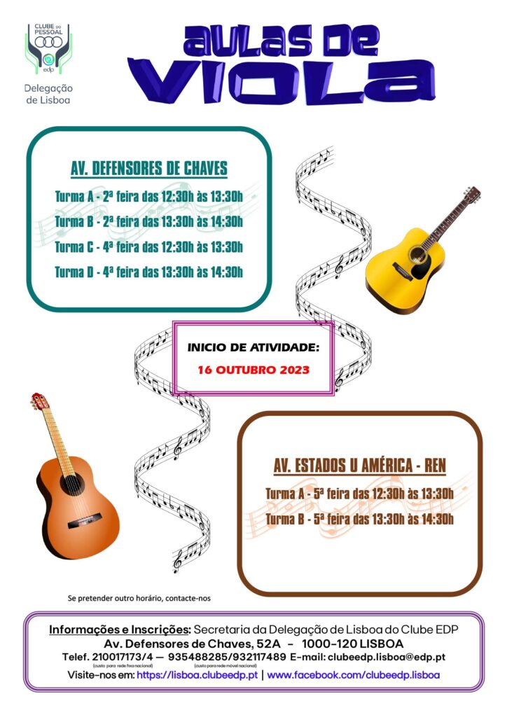 Aulas de Viola 2023—2024 no Clube EDP Lisboa e edifício REN da Av. EUA a partir de 16 de outubro Inscrições Abertas