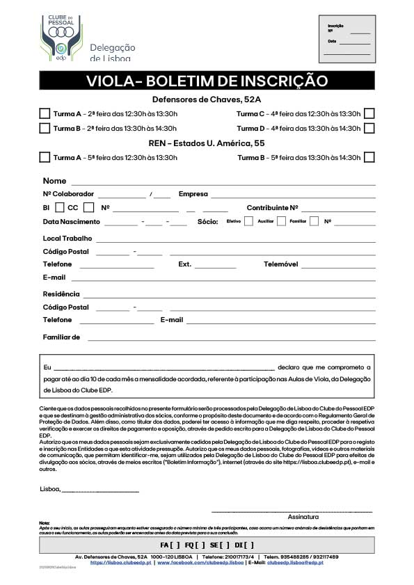 Aulas de Viola nas instalações Clube EDP Lisboa, na Avenida Defensores de Chaves, 52A e no edifício REN da Av. Estados Unidos da América em Lisboa.