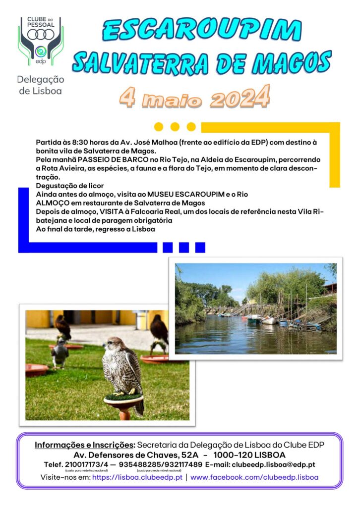 De barco, pelo Rio Tejo, seguimos a Rota Avieira e fazemos uma visita ao Museu “Escaroupim e o Rio”.  À tarde, depois do almoço em Salvaterra de Magos,  visitamos a Falcoaria Real.