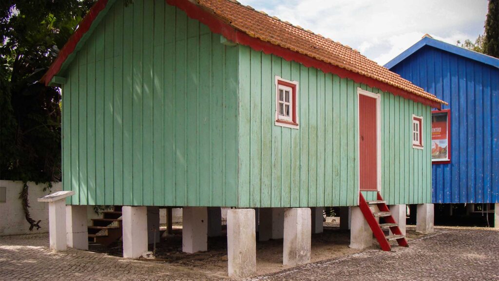 Características casas de palafita, na Aldeia do Escaroupim