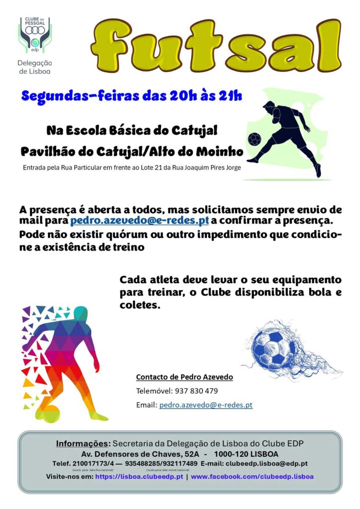29SetFacebookTwitterGoogle+LinkedInPinterest Reiniciámos os treinos de Futsal Treinos às segundas, 20h-21h, na Escola Básica do Catujal Pavilhão do Catujal/ Alto do Moinho Foto: Torneio Sideline em 2024 Treinos Futsal Estamos a retomar os treinos de futsal.Segundas-feiras, 20—21h, na Escola Básica do Catujal Pavilhão do Catujal/ Alto do Moinho.A presença é aberta a todos, mas solicitamos sempre envio de e-mail para pedro.azevedo@e-redes.pt a confirmar a presença.Cada atleta deve levar o seu equipamento para treinar. O Clube disponibiliza bola e coletes.Contacta-nos! Contacta-nos! pedro.azevedo@e-redes.pt Tel. 937 830 479 Futsal Clube EDP Lisboa Clube EDP Lisboa Reiniciámos os treinos de Futsal Futsal Clube EDP Lisboa