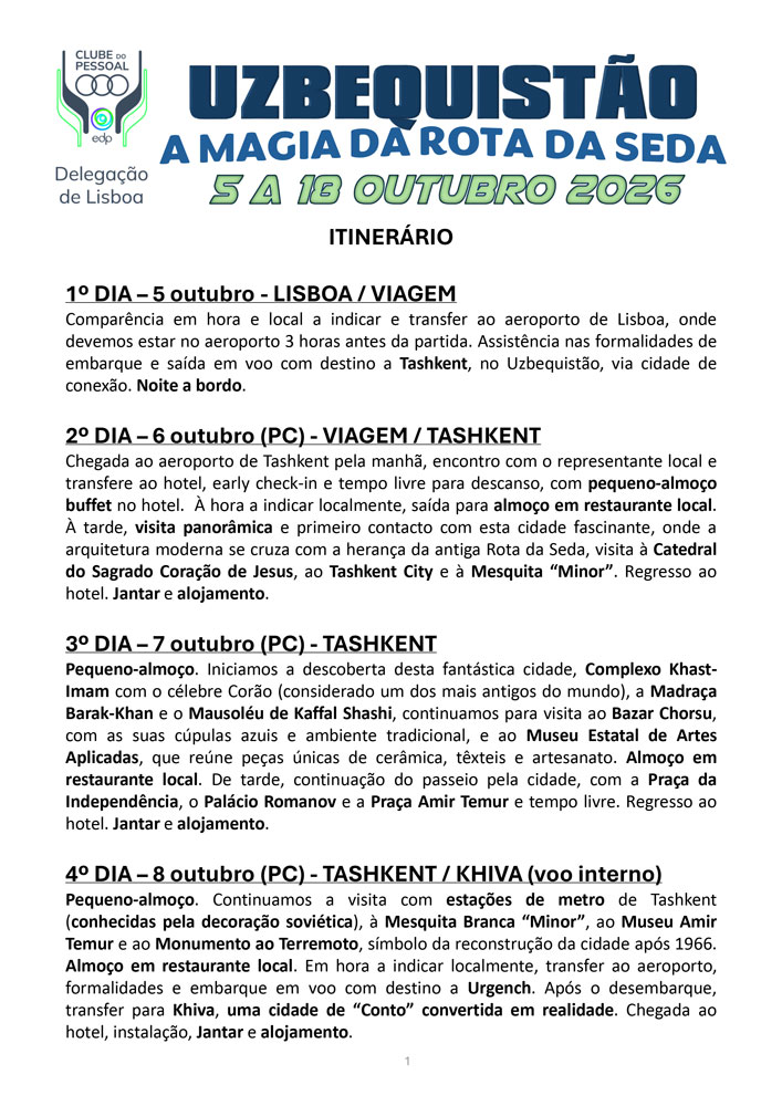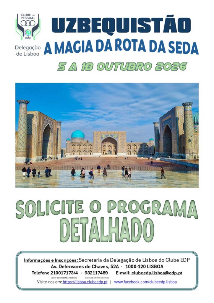 Samarcanda é uma das cidades mais antigas da Ásia Central que prosperou graças à sua localização, num vale fértil irrigado e na Rota da Seda, no caminho entre a China e o Mediterrâneo. Iniciamos o nosso périplo por esta cidade, na Praça Registan. Visitamos Mausoléu Gur-Emir e fazemos uma prova de vinhos na histórica Adega Hovrenko. Inesquecível, será concerteza, o passeio noturno na Praça Registan com as três grandes madraças iluminadas Ulugbek, Sherdor e Tillya-Kari.Visitamos a ruína da majestosa Mesquita Bibi-Khanum e à Necrópole Shah-i-Zinda. No Bazar Siyab, poderemos provar frutas secas, pão e especiarias. Visitamos o Museu dos Tapetes e o Museu Afrosiyab. Muito próxima de Samarcanda, situa-se a aldeia de Konigil, onde teremos a oportunidade de conhecer as tradições e artesanato uzbeques. Assistimos ao fabrico de papel a partir da casca da amoreira e à prensagem de azeite e a moagem de farinha em moinhos tradicionais e almoçamos na aldeia. De regresso a Samarcanda podemos explorar bazares e lojas e à noite fazemos um jantar tradicional de despedida, antes do regresso a Lisboa.