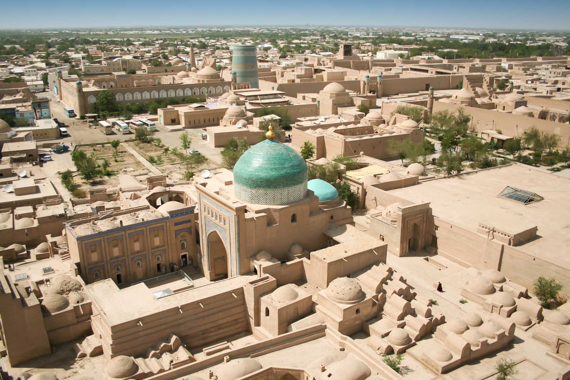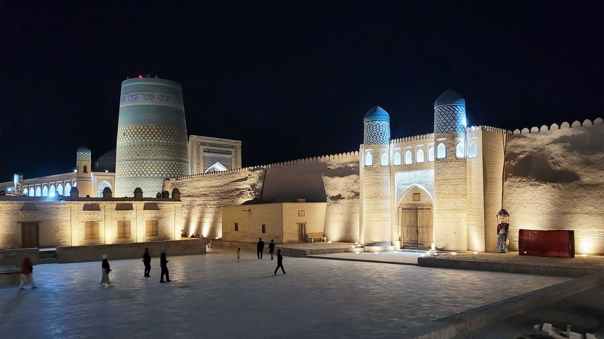 Na cidade de Khiva, destacamos a visita a Itchan Kala, uma cidade muralhada no interior de Khiva. Visitamos a Mesquita Juma, o Palácio Tash Hauli e ao final do dia podemos admirar o Minarete Islam Khoja e visitamos a Madraça Islam Khoja. Faremos dois jantares especiais, um com espetáculo folclórico uzbeque e outro, num terraço, com vista panorâmica de Ichan-Kala.