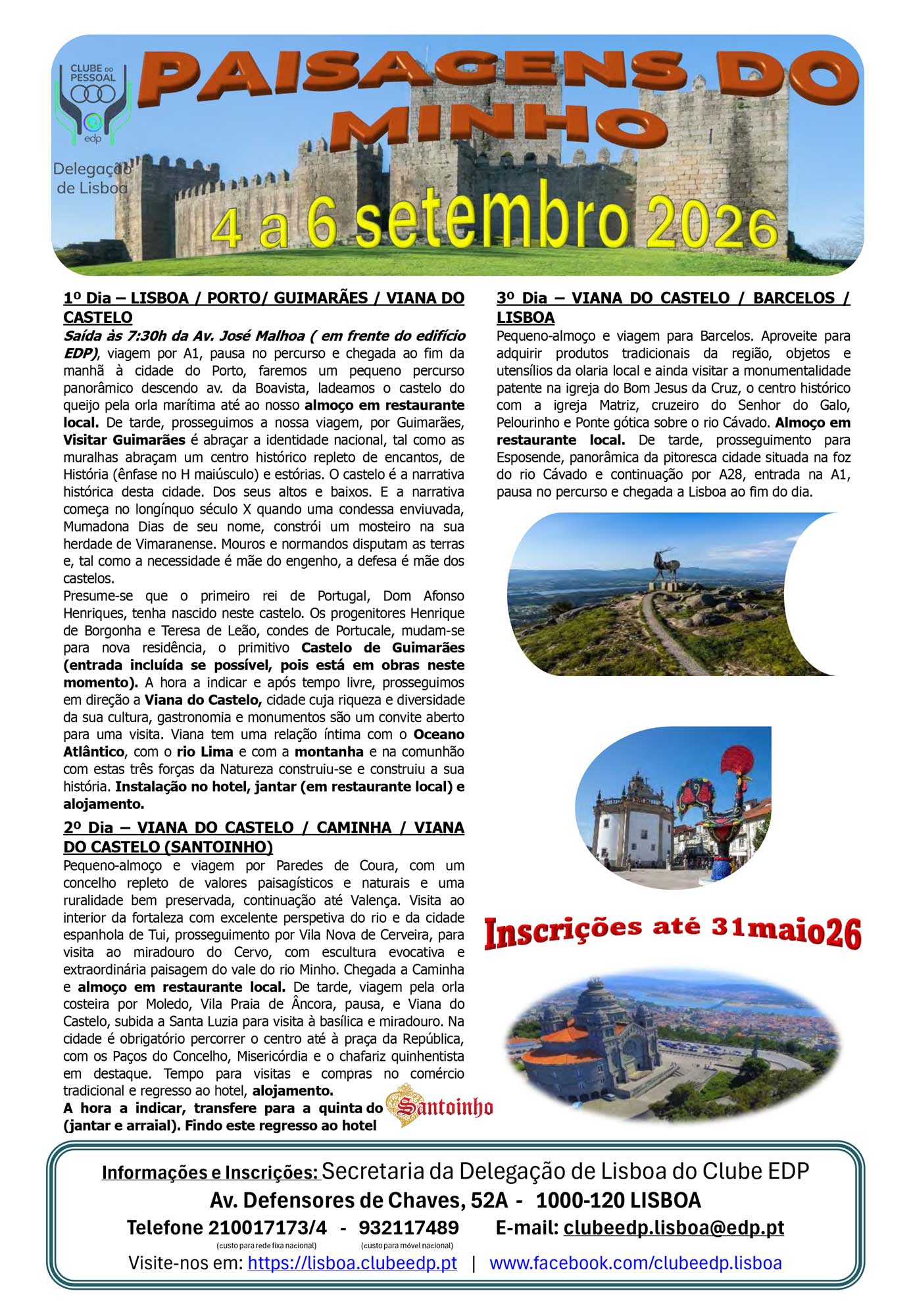 Pequeno-almoço e viagem por Paredes de Coura, com um concelho repleto de valores paisagísticos e naturais e uma ruralidade bem preservada. Continuação até Valença. Visita ao interior da fortaleza com excelente perspetiva do rio e da cidade espanhola de Tui, prosseguimento por Vila Nova de Cerveira, para visita ao Miradouro do Cervo, com escultura evocativa e extraordinária paisagem do vale do Rio Minho. Chegada a Caminha e almoço em restaurante local. De tarde, viagem pela orla costeira por Moledo, Vila Praia de Âncora, pausa, e Viana do Castelo, subida a Santa Luzia para visita à basílica e miradouro. Na cidade é obrigatório percorrer o centro até à praça da República, com os Paços do Concelho, Misericórdia e o chafariz quinhentista em destaque. Tempo para visitas e compras no comércio tradicional e regresso ao hotel, alojamento.