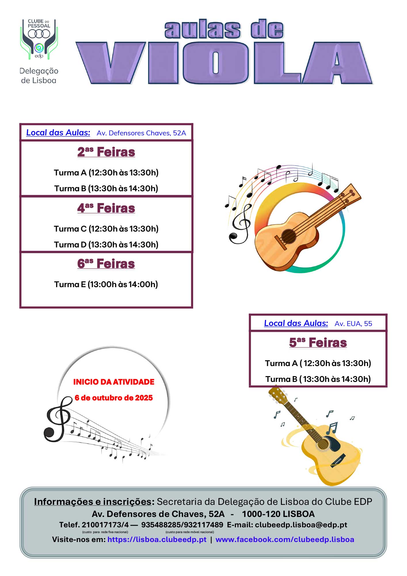 As aulas de viola do Clube EDP lisboa, destinam-se todos os sócios e familiares, de todas as idades, com ou sem conhecimentos de música, ou prática de tocar viola, ou outro instrumento. São aulas de grupo, que proporcionam a troca de experiências e aprendizagens entre alunos.